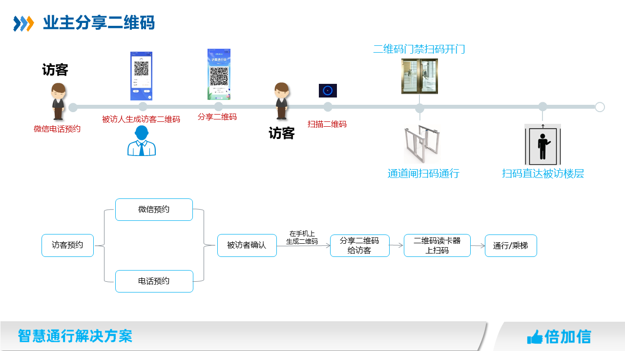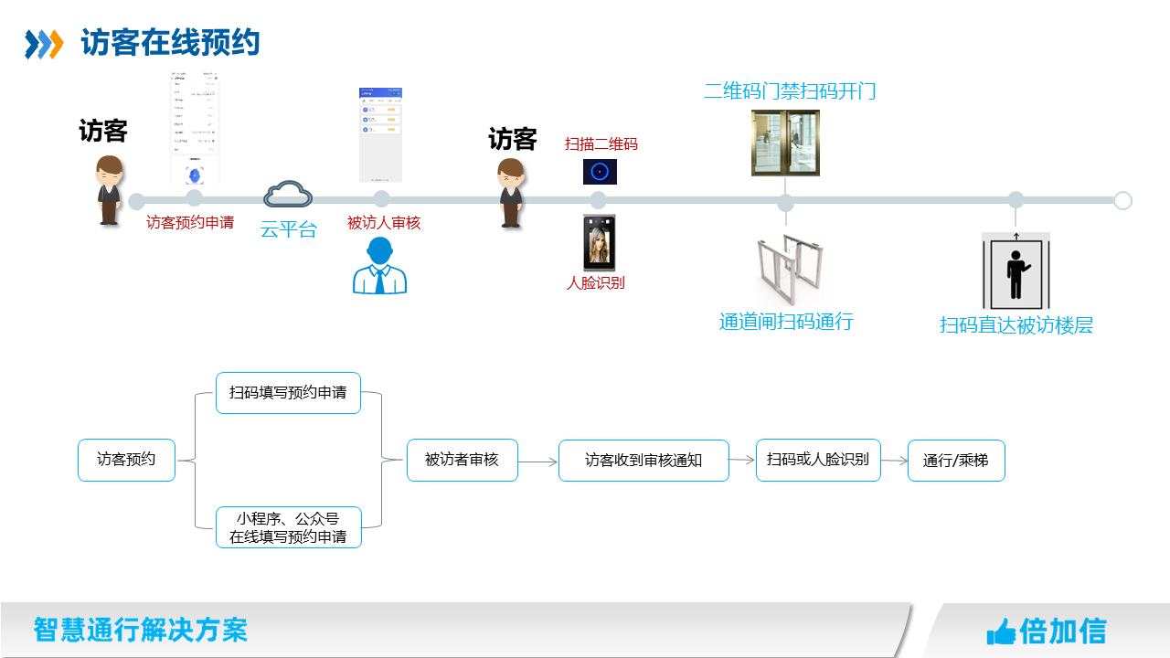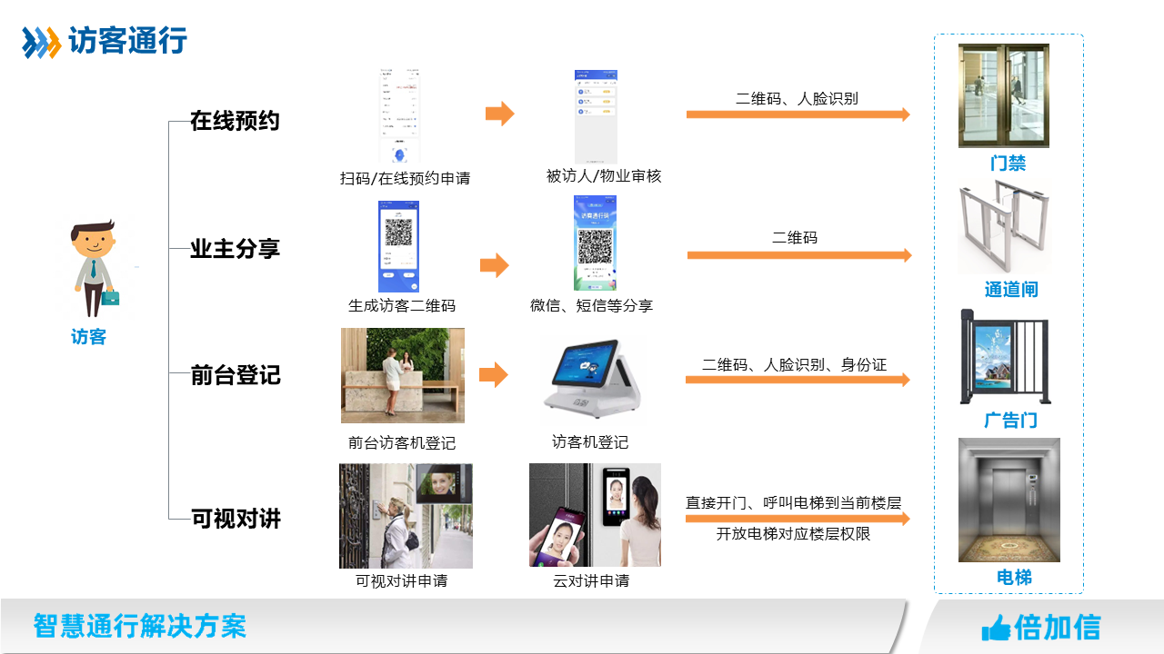 在住宅小區、寫字樓、園區、企事業單位等場所,物業往往針對外來人員都需要管控,我司提供多種訪客通行解決方案,滿足不同場景訪客進出物業管理需求。